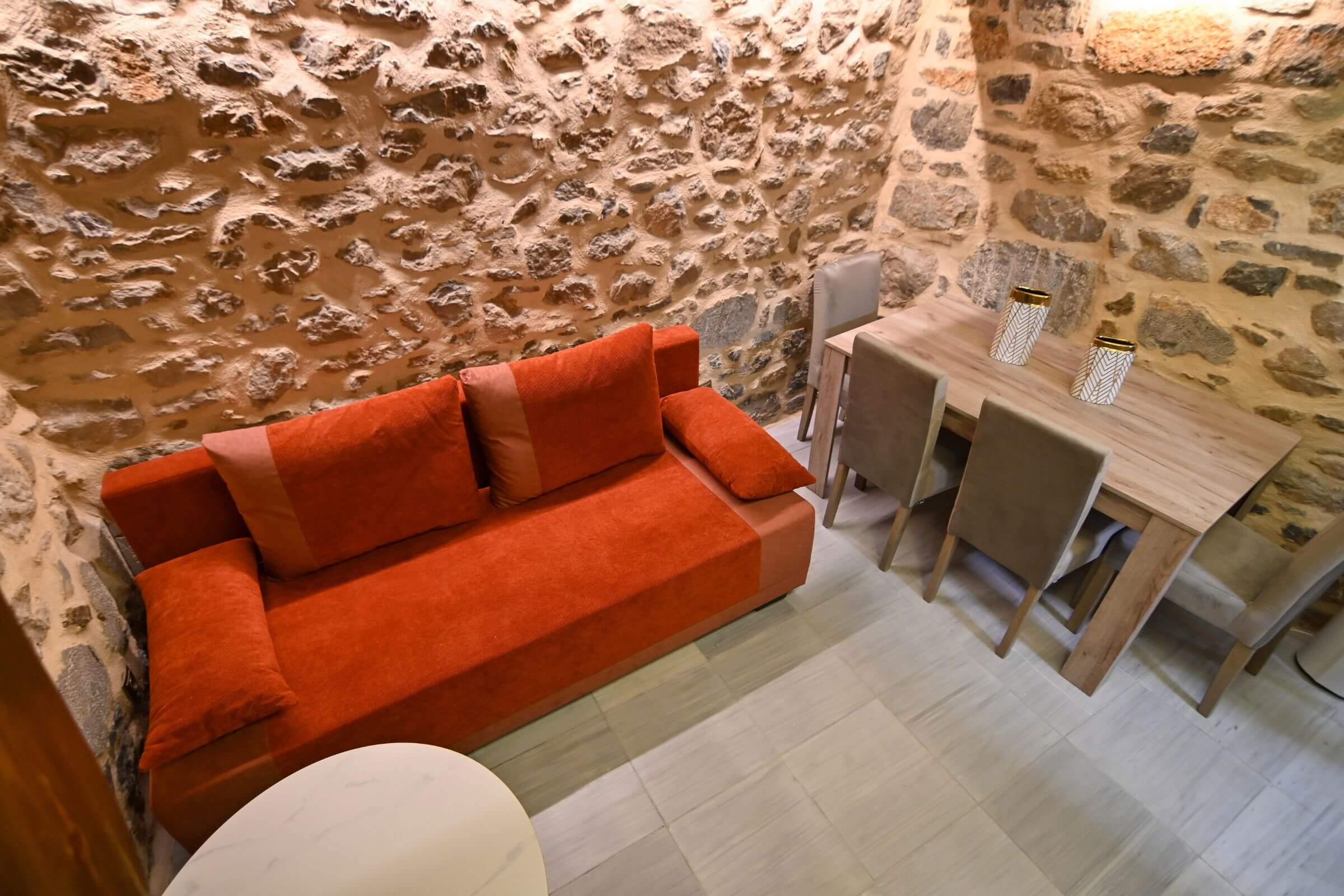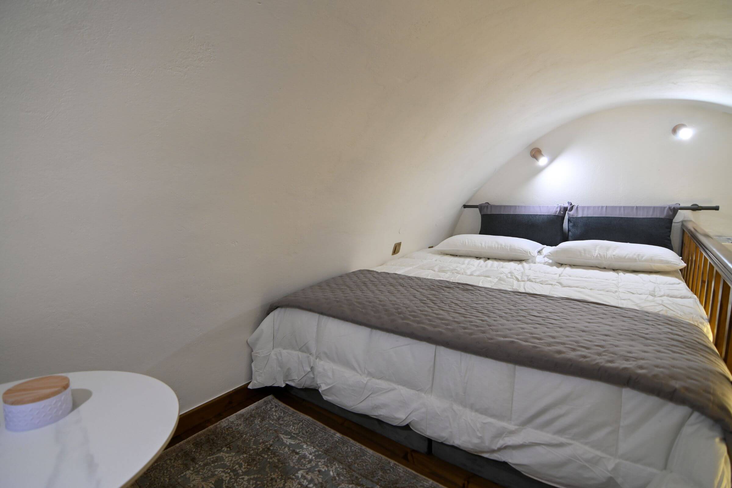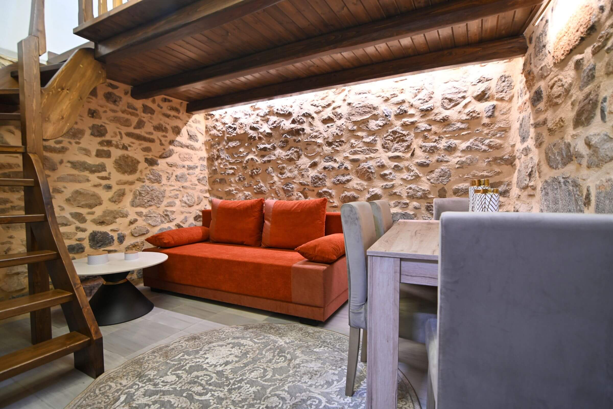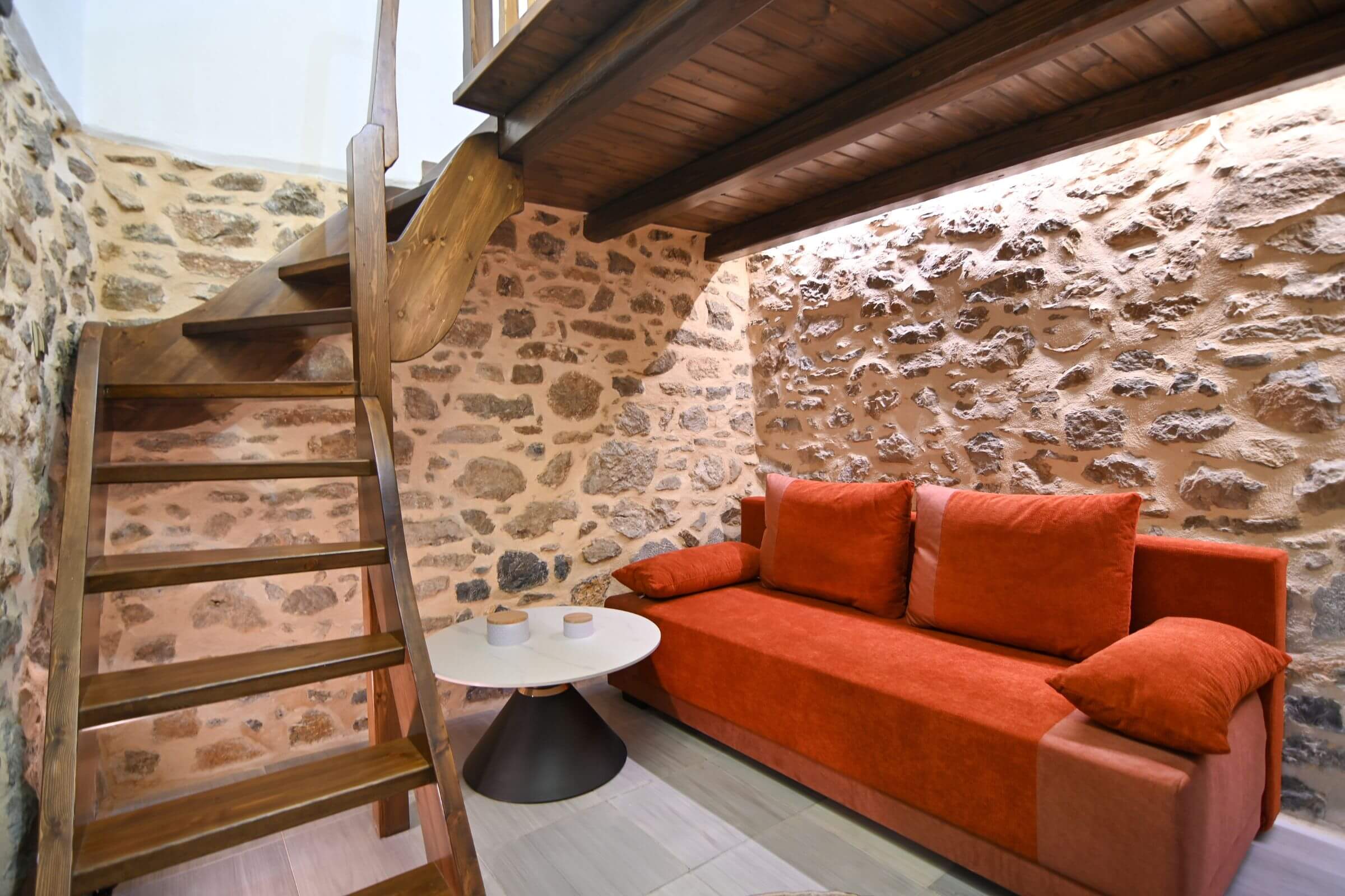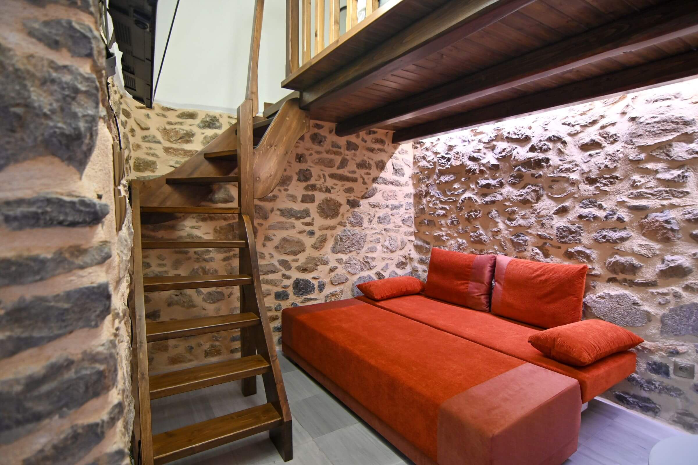The 25 m² Didima apartment offers a charming balance between tradition and contemporary design. With stone walls and a wooden loft hosting a double bed, the space exudes a warm atmosphere and distinctive character.