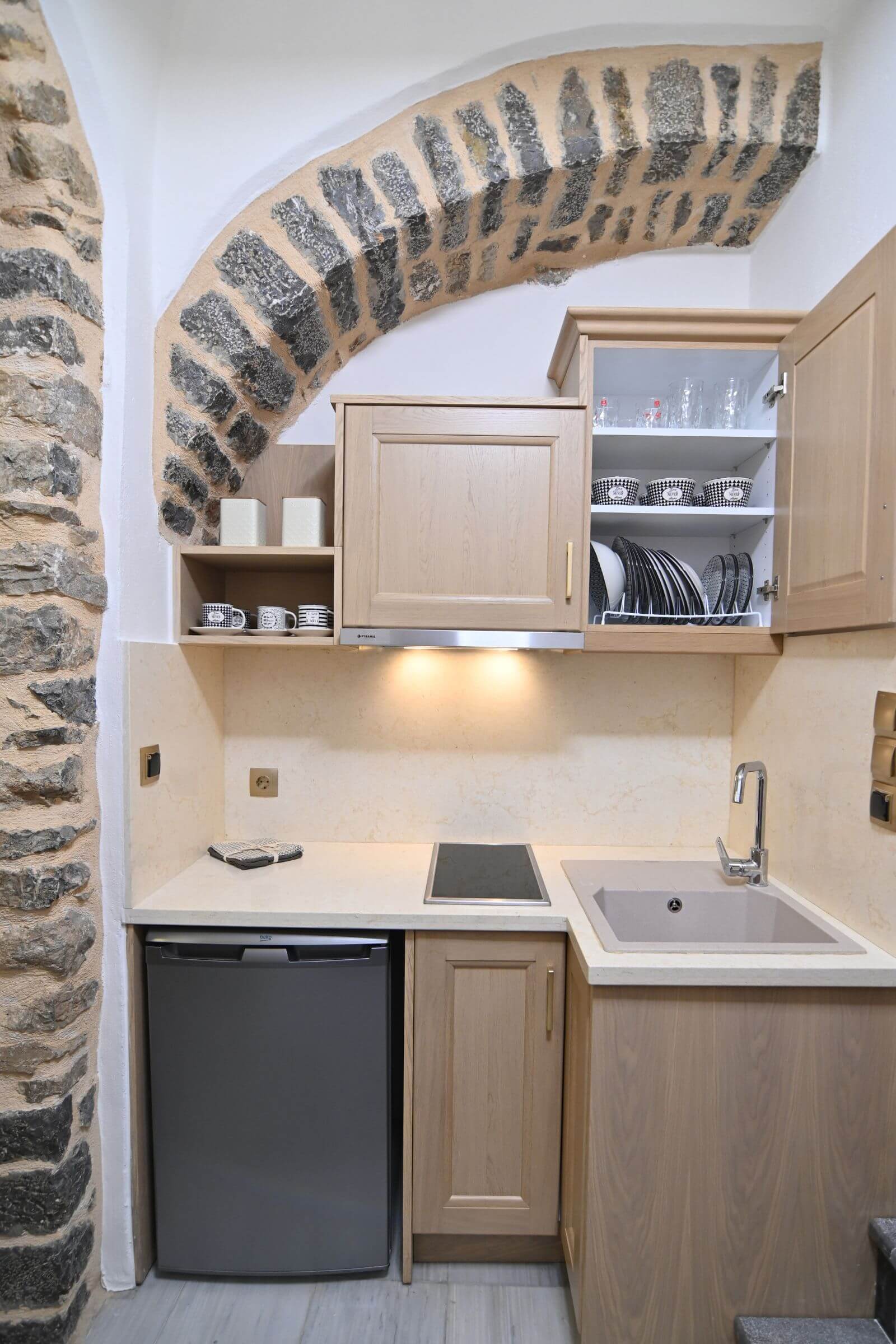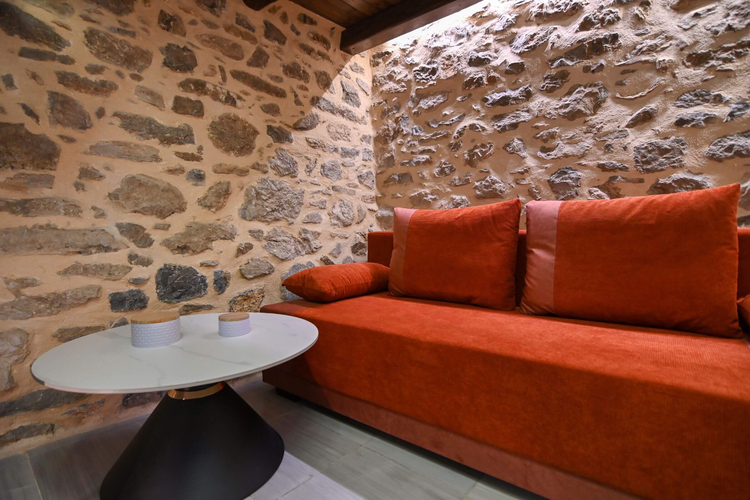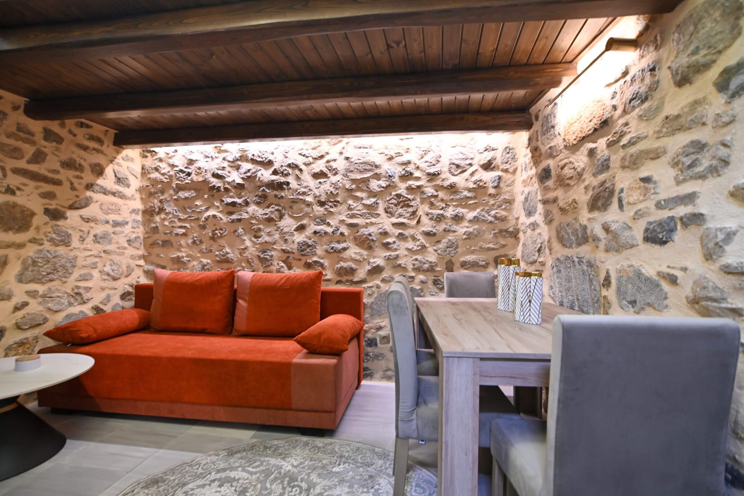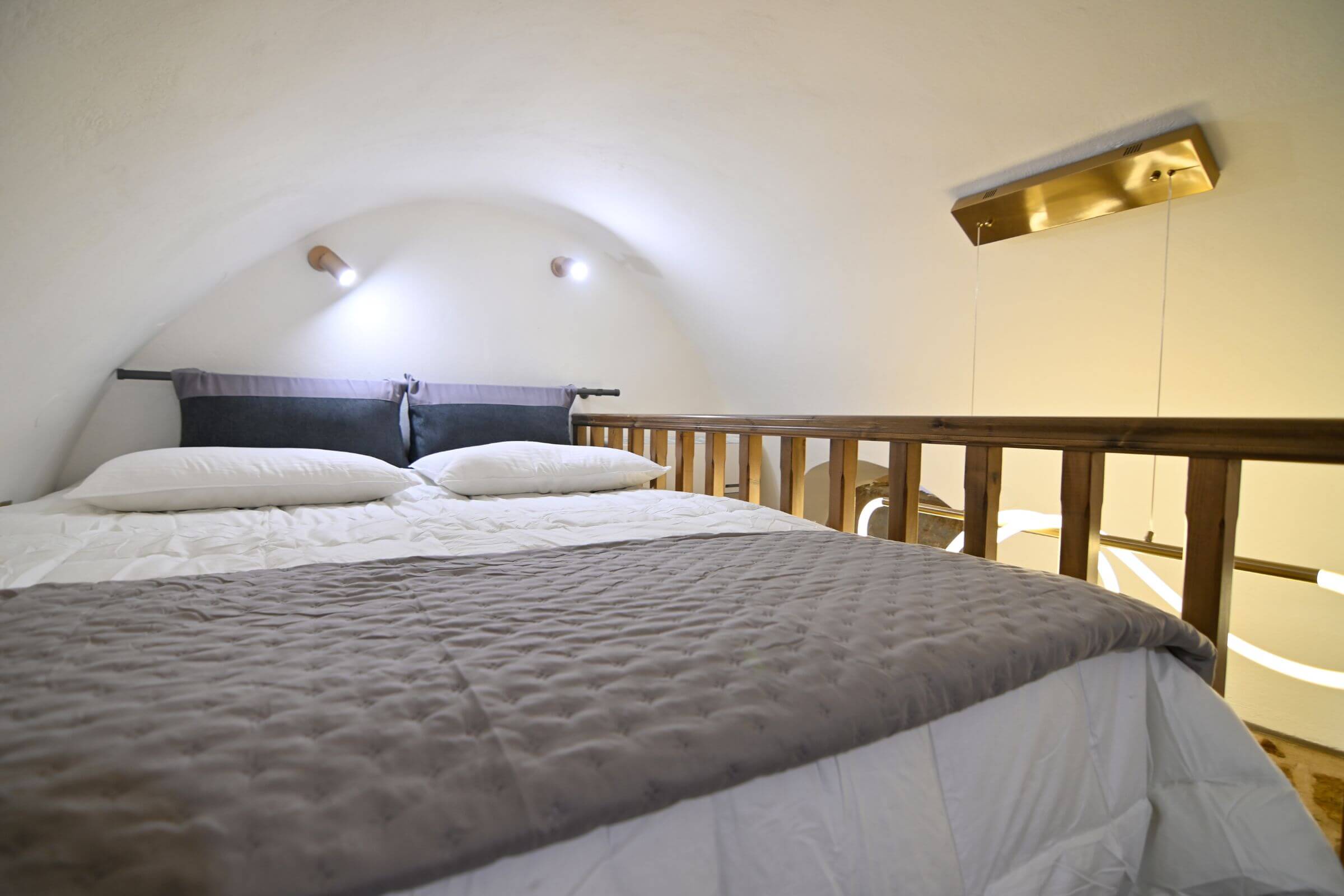 The 25 m² Didima apartment offers a charming balance between tradition and contemporary design. With stone walls and a wooden loft hosting a double bed, the space exudes a warm atmosphere and distinctive character.