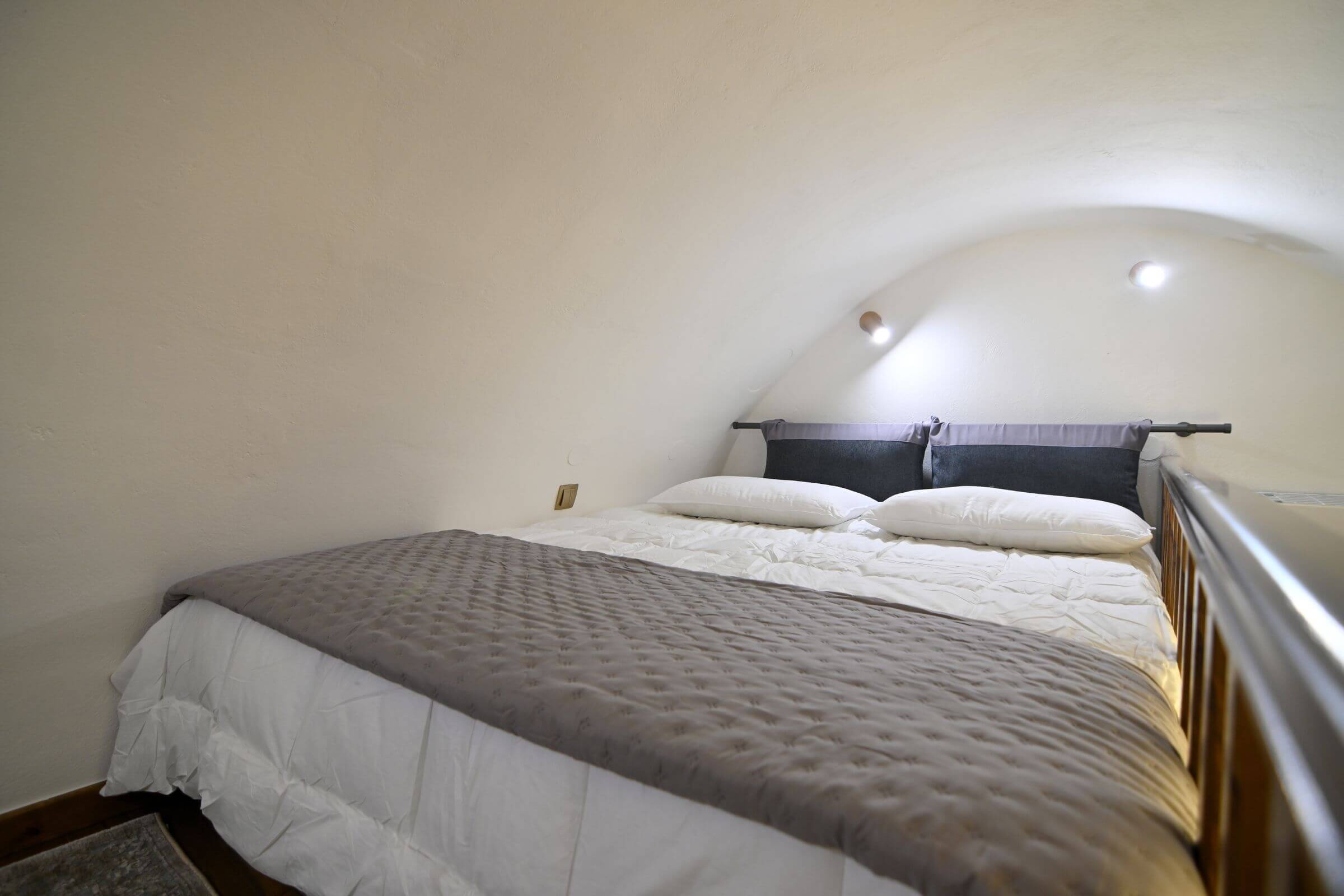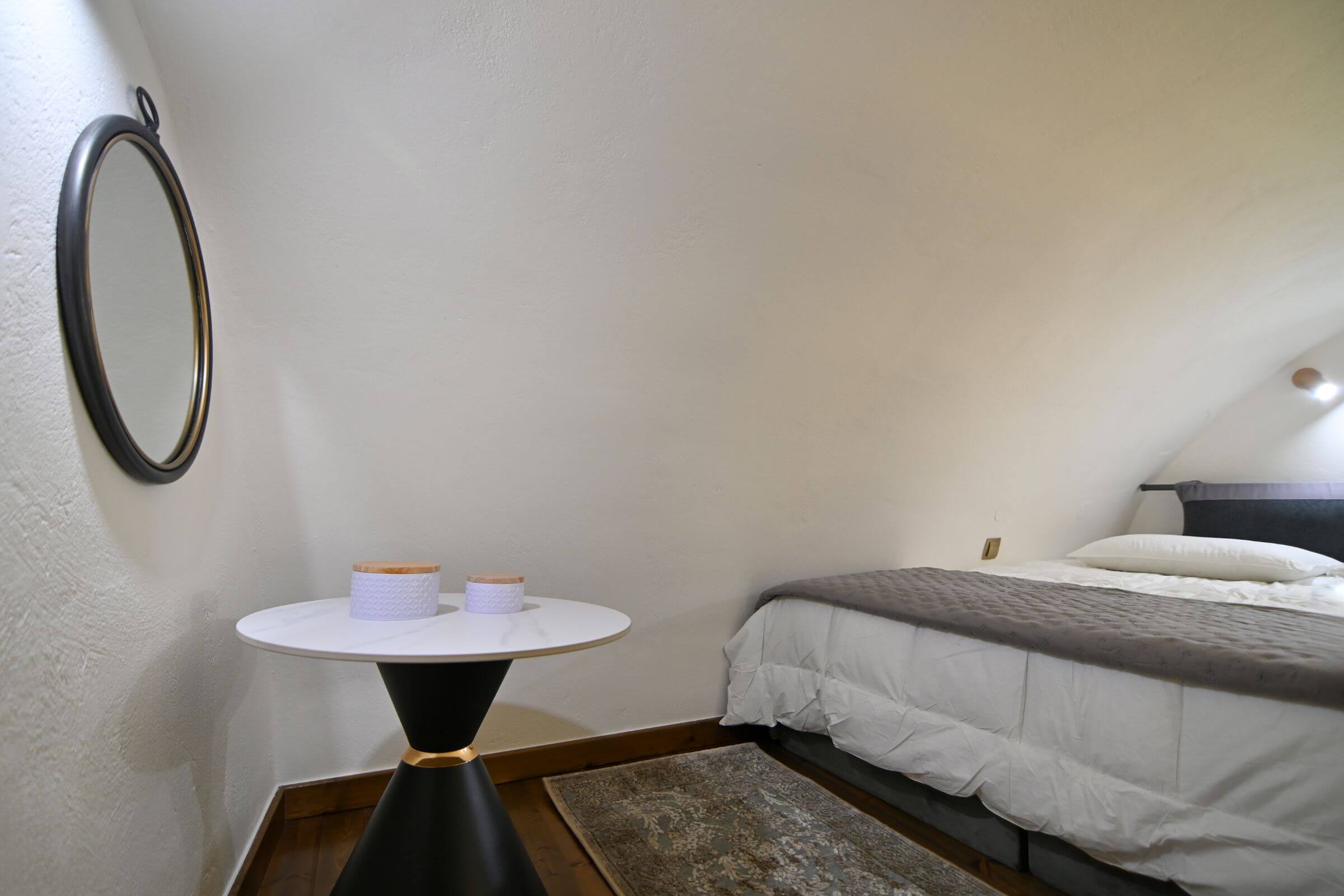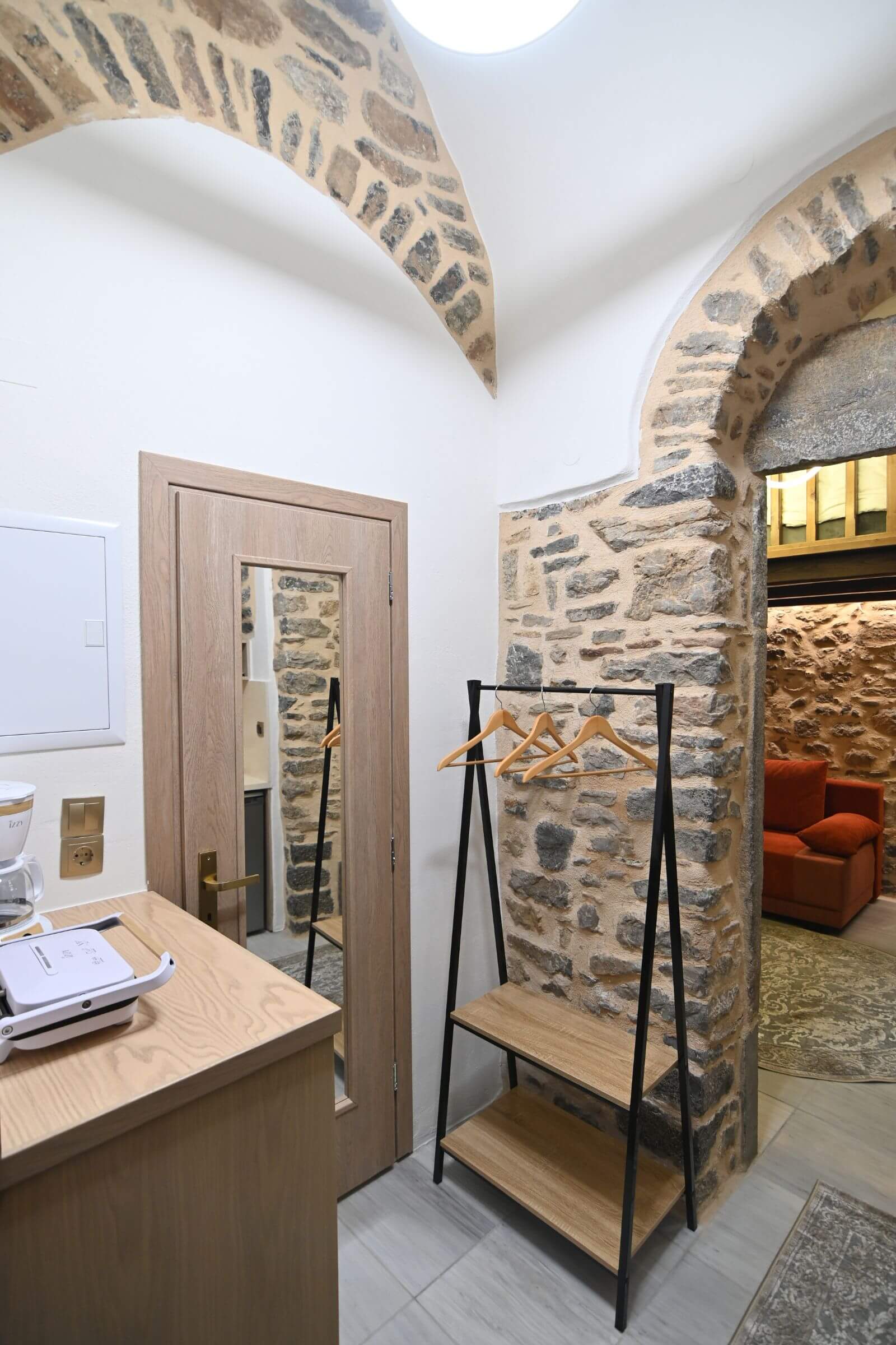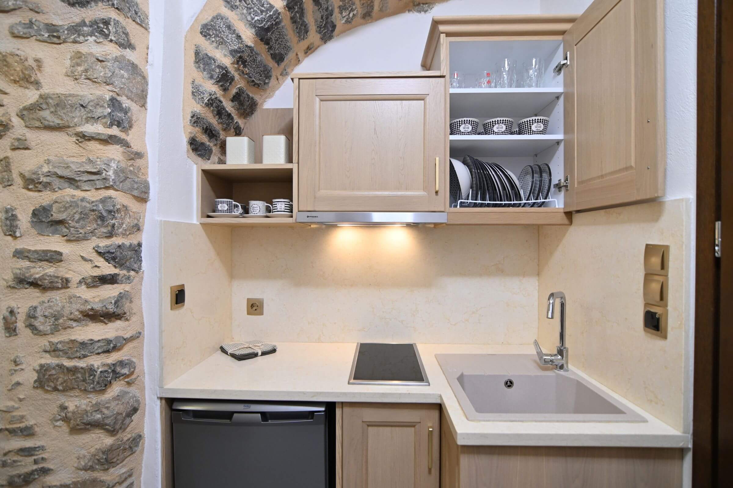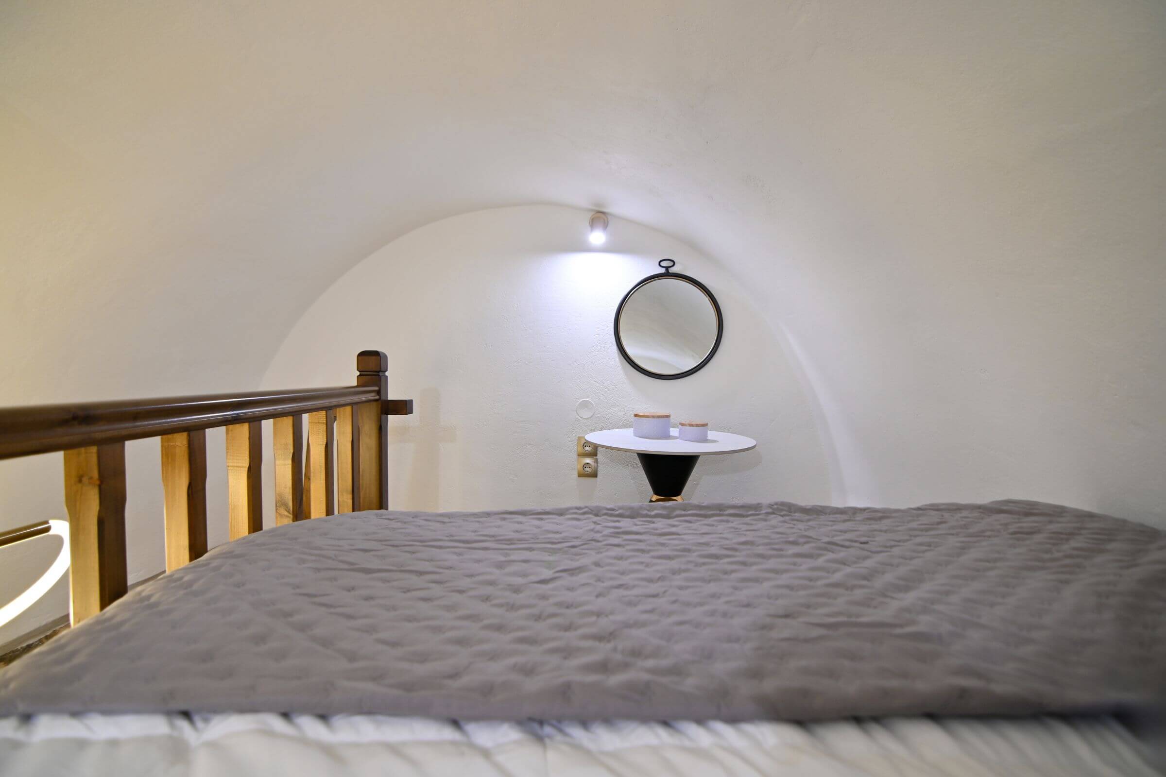 The 25 m² Didima apartment offers a charming balance between tradition and contemporary design. With stone walls and a wooden loft hosting a double bed, the space exudes a warm atmosphere and distinctive character.