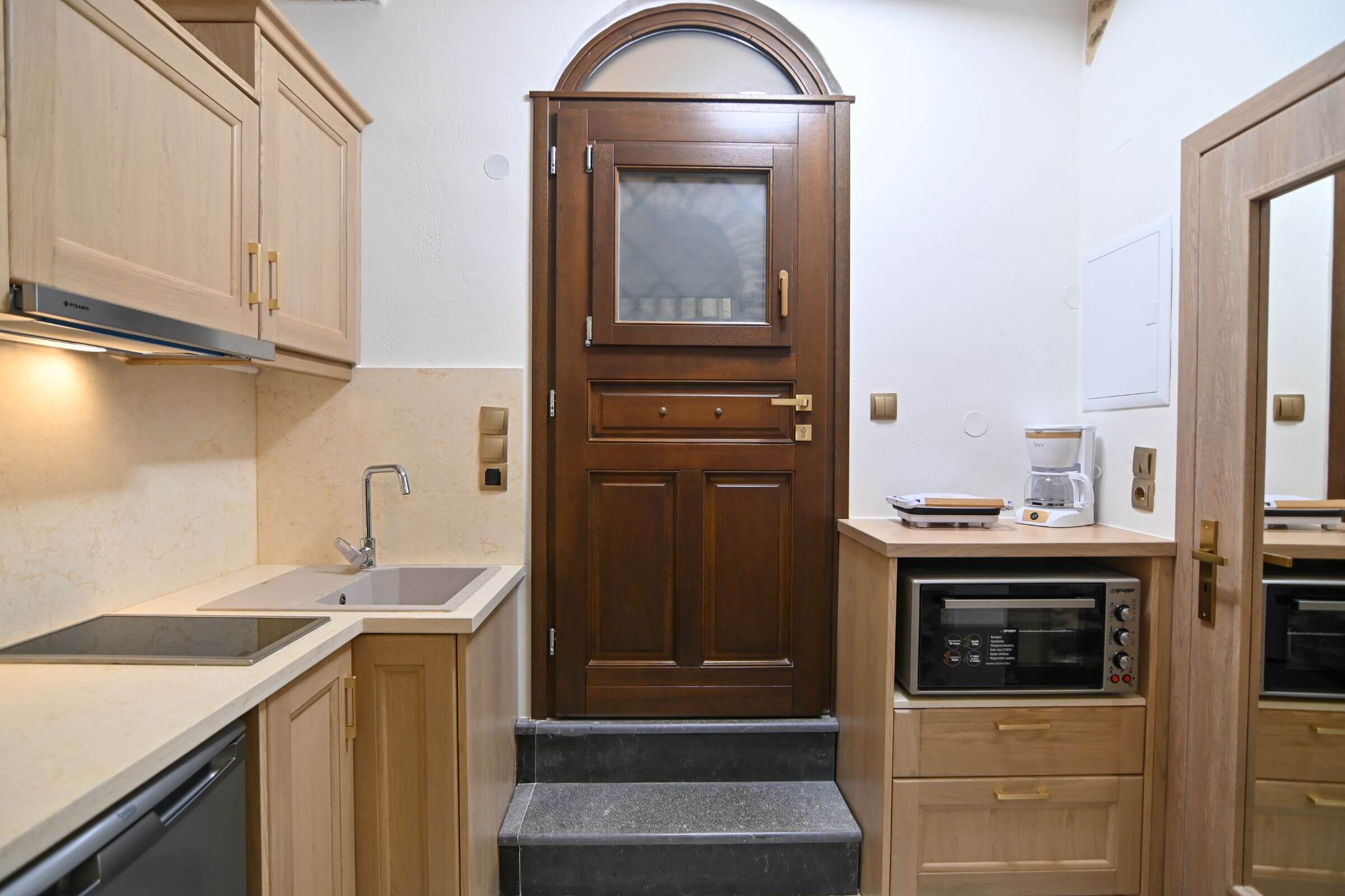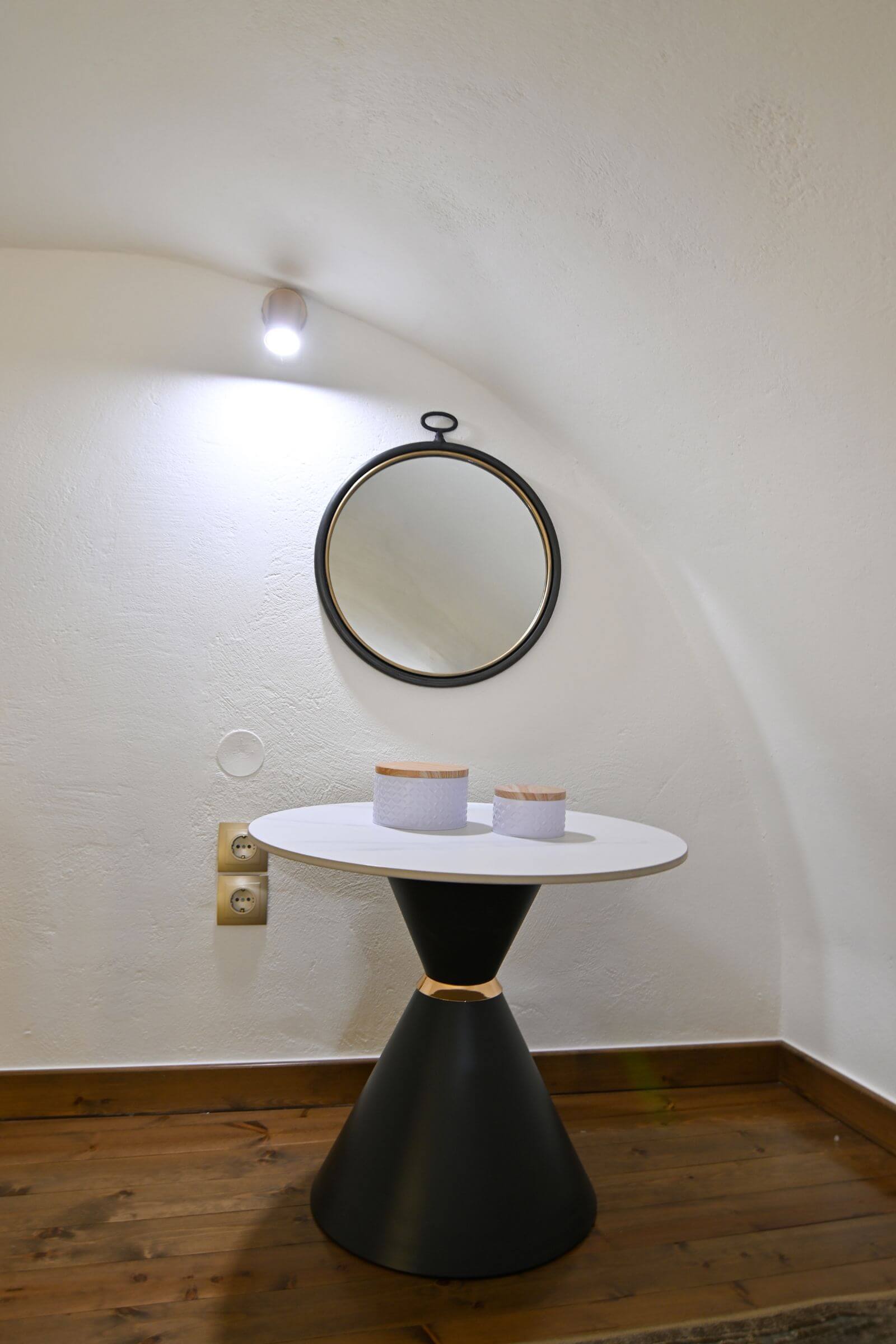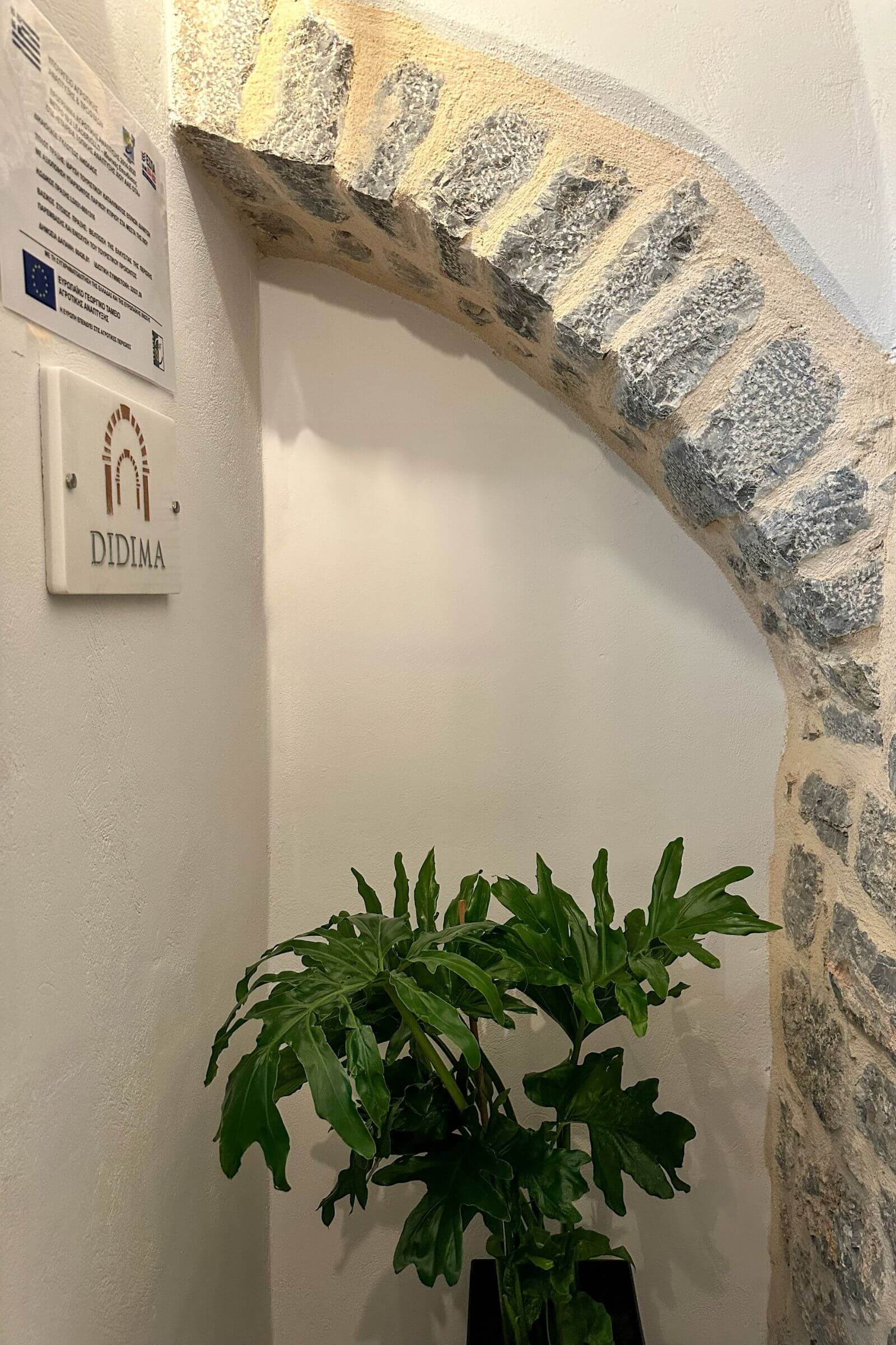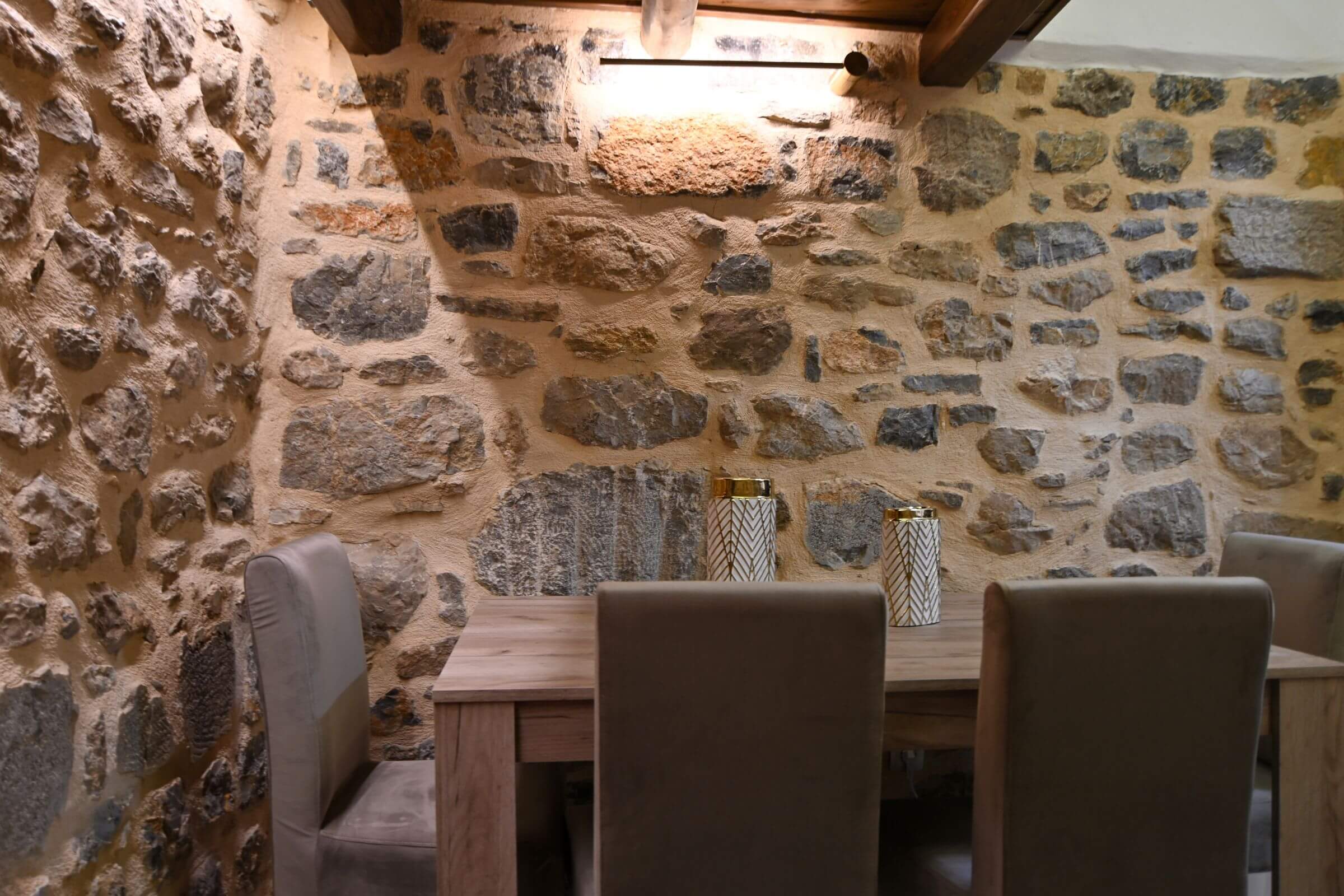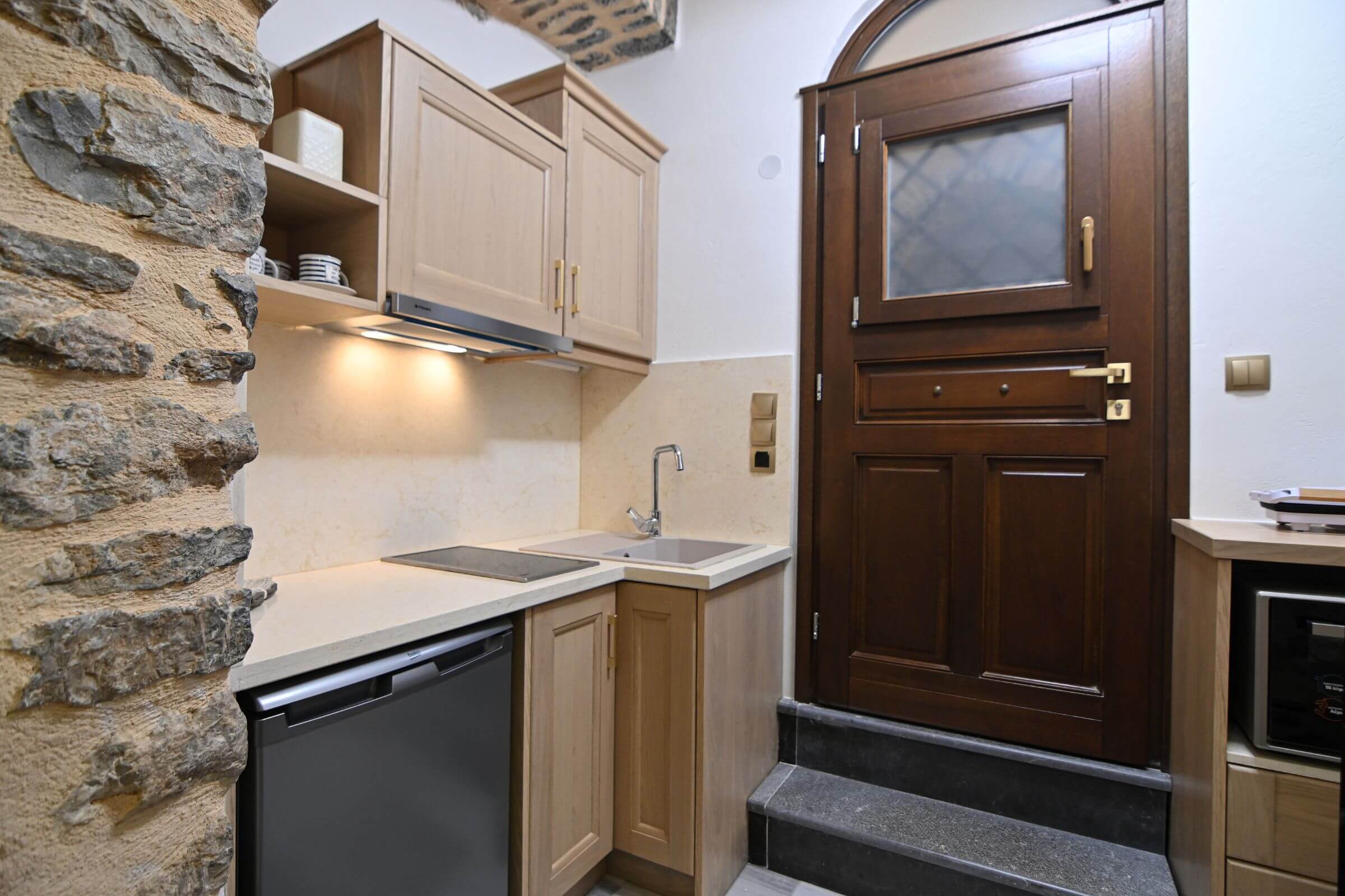 The 25 m² Didima apartment offers a charming balance between tradition and contemporary design. With stone walls and a wooden loft hosting a double bed, the space exudes a warm atmosphere and distinctive character.